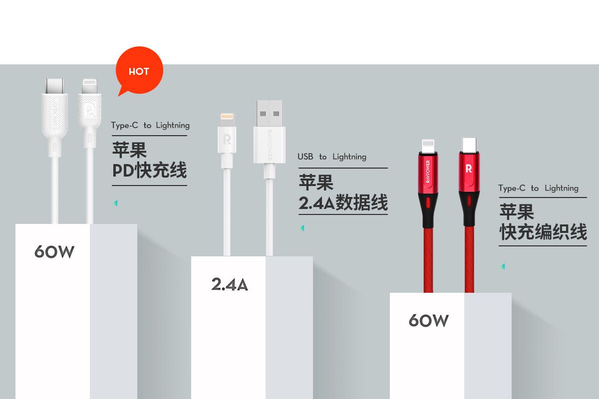 数据线方面RAVpower是苹果认证品牌,所推出的Lightning接口数据线均取得了苹果MFi认证,可以跟随IOS升级不影响使用。Lightning线缆覆盖了USB-C to Lightning苹果快充线、USB-A to Lightning苹果线、耐用的编织快充线等。另外对于最常用的USB-C to USB-C数据线,RAVpower也有编织线可供选择,长网尾设计拥有更高的耐用度。
