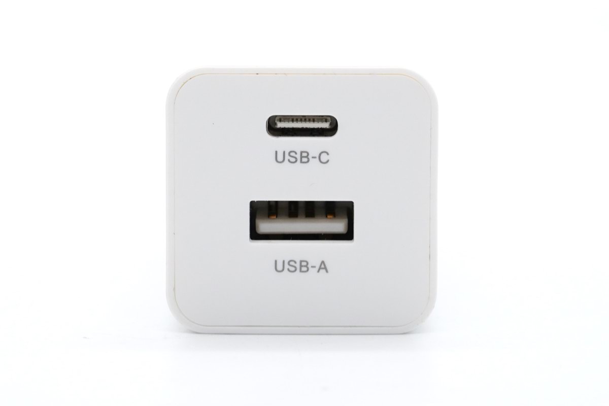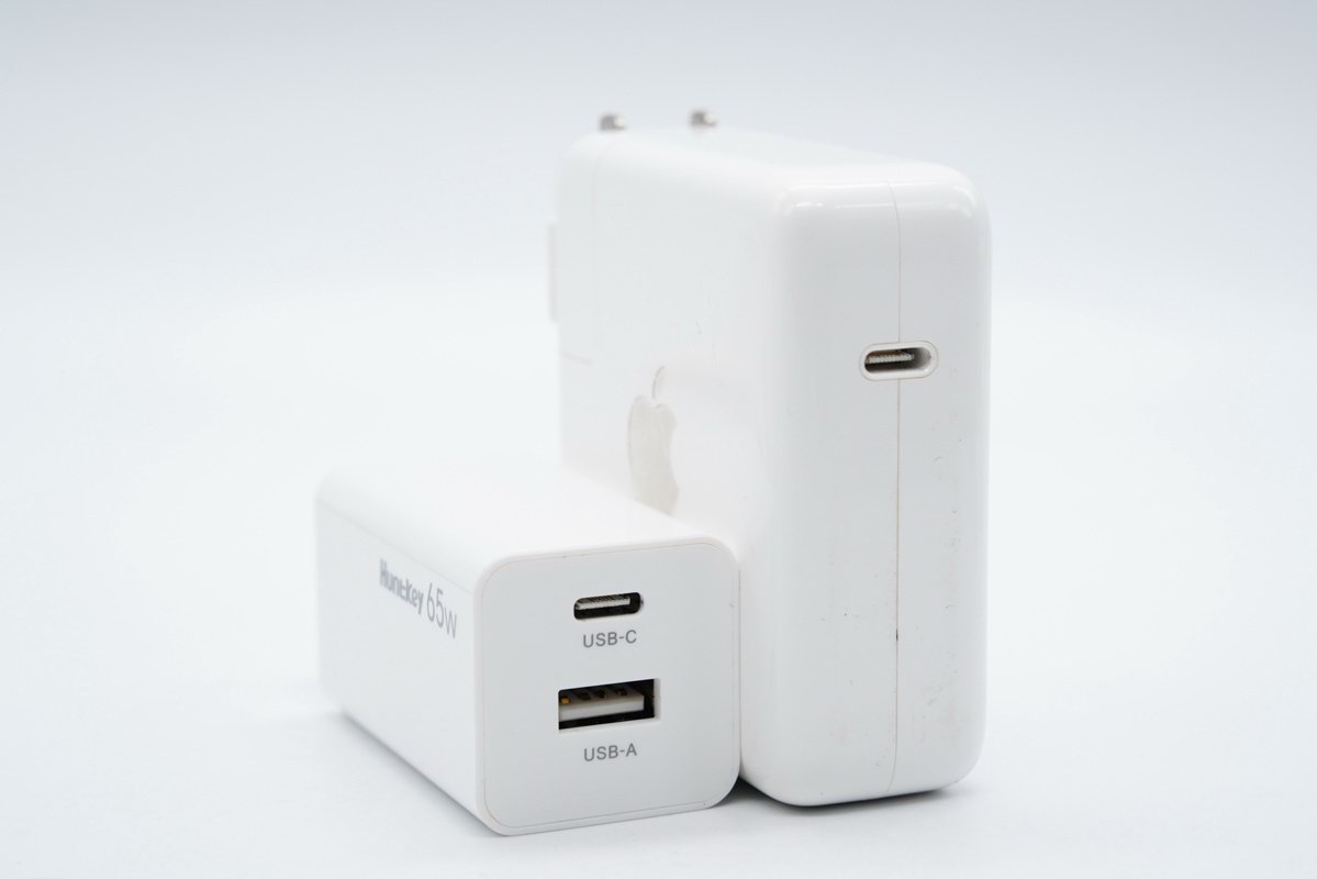 得益于条形柱状设计,在插线板上使用并不会干预相邻插孔空间,实测航嘉新品65W氮化镓充电器三围只有32.45mm X 32.53mm X 59.86mm,按照额定功率65W计算,其功率密度达到1.02W/cm³,突破了每立方厘米1瓦的行业大关。与苹果为Macbook配送的61W PD充电器相比,航嘉新品65W氮化镓充电器拥有更多接口、更大输出功率,同时体积比苹果61W还小一半以上。