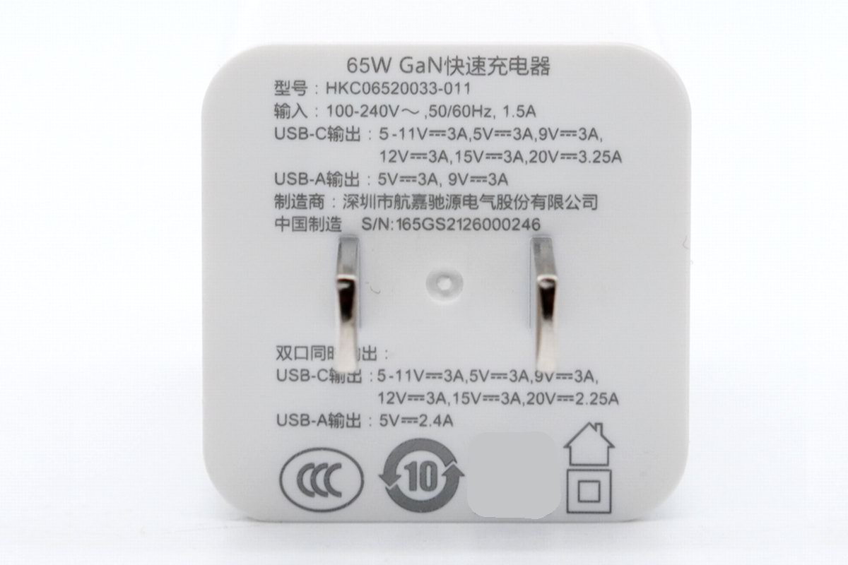 航嘉是国内知名电源品牌,生产的PC电源、工业/行业电源、适配器、充电器、插座等产品涵盖全球市场终端众多领域,面对人们对数码产品充电的高品质追求,航嘉推出了65W 1A1C氮化镓充电器,并率先在国内获得了CCC+CQC双认证,前者俗称“安规认证”,是以一个及格的门槛标准进行设定,后者俗称“性能认证”,测试项目更多也更为严谨,代表着航嘉追求打造更高分的优秀产品。