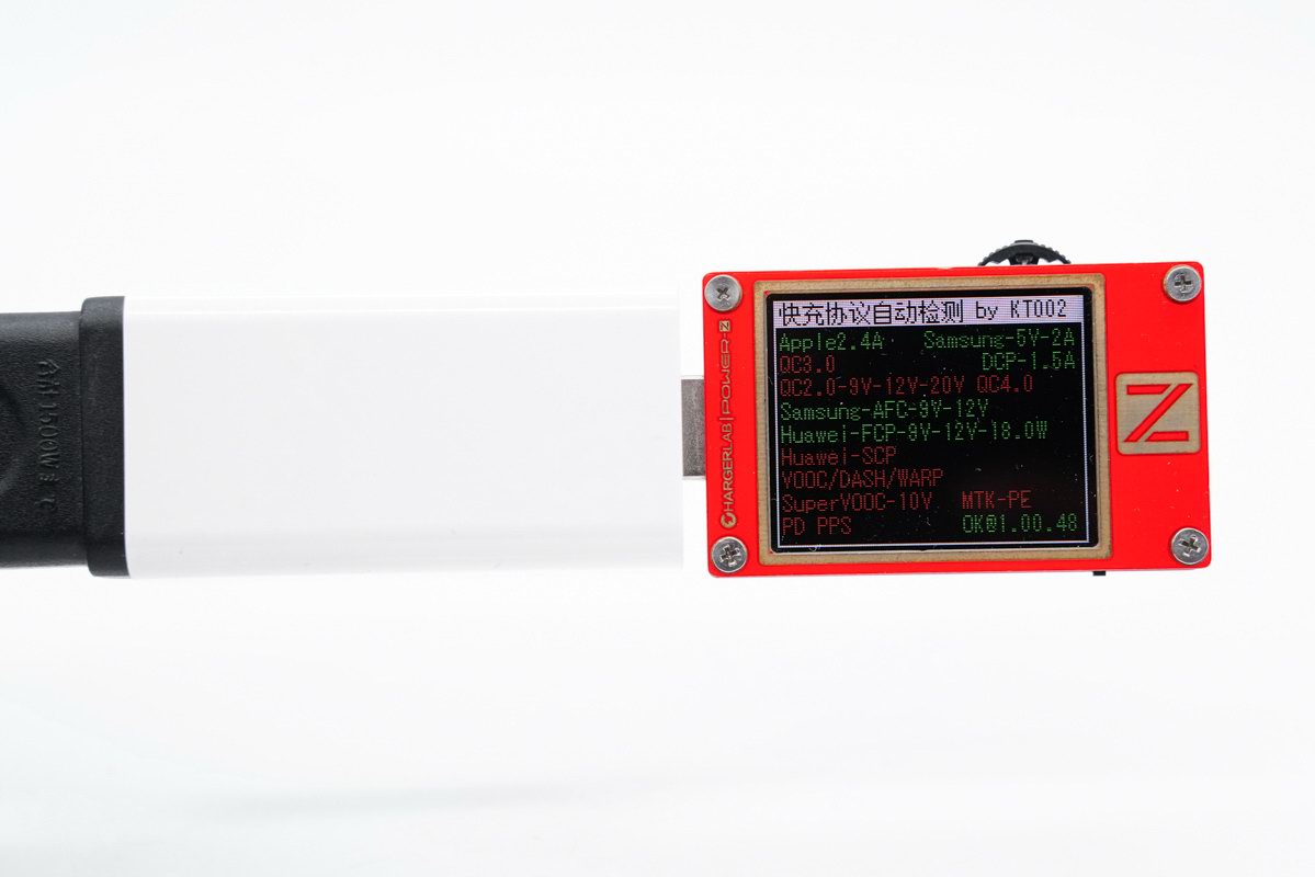 使用POWER-Z KT002 USB测试仪对航嘉65W 1C1A氮化镓充电器进行快充协议轮询,USB-C接口带有APPLE2.4A、Samsung5V2A、DCP、FCP快充协议。