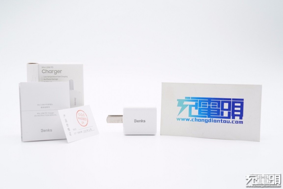 邦克仕20W充电器表面钢琴烤漆工艺处理,边角圆润,同时又兼具几何学硬朗风格,此外充电器机身一侧印有Benks品牌logo,充电器采用固定式国标插脚。单USB-C输出口配置,支持5V3A、9V2.22A、12V1.66A三个固定电压输出,三围尺寸31.9mm X 27.59mm X 27.53mm,功率密度0.82W/cm³。