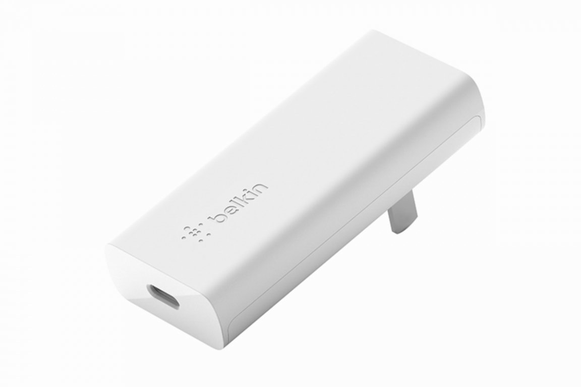 贝尔金20W氮化镓充电器与市面上大部分充电器不同,它采用了超薄的直板结构设计,全白色的外观表面磨砂处理,正下方凹印着贝尔金LOGO“belkin”,十分有个性。内置氮化镓功率器件,具备5V3A和9V2.22A两组电压档位,可折叠插脚设计,超扁平的外观三围尺寸32.6mm * 15mm * 77mm,功率密度0.53W/cm³,在插座上使用完全不占地方,加上下部USB-C出线孔,线缆更加服帖减少缠绕几率,桌面更加整洁。