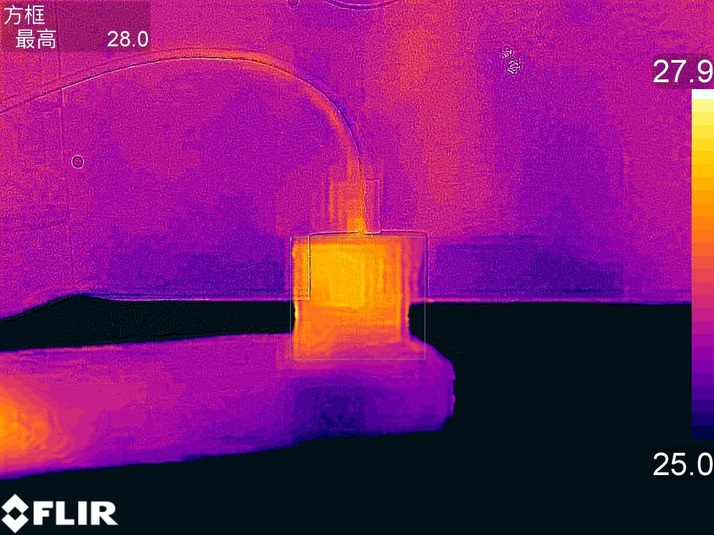 对充电器的温升进行测试,测试条件为在温度约为25℃的恒温箱内以9V 2.22A 20W的功率持续输出一小时进行测试。准备开始测试前,最高温度为28℃。