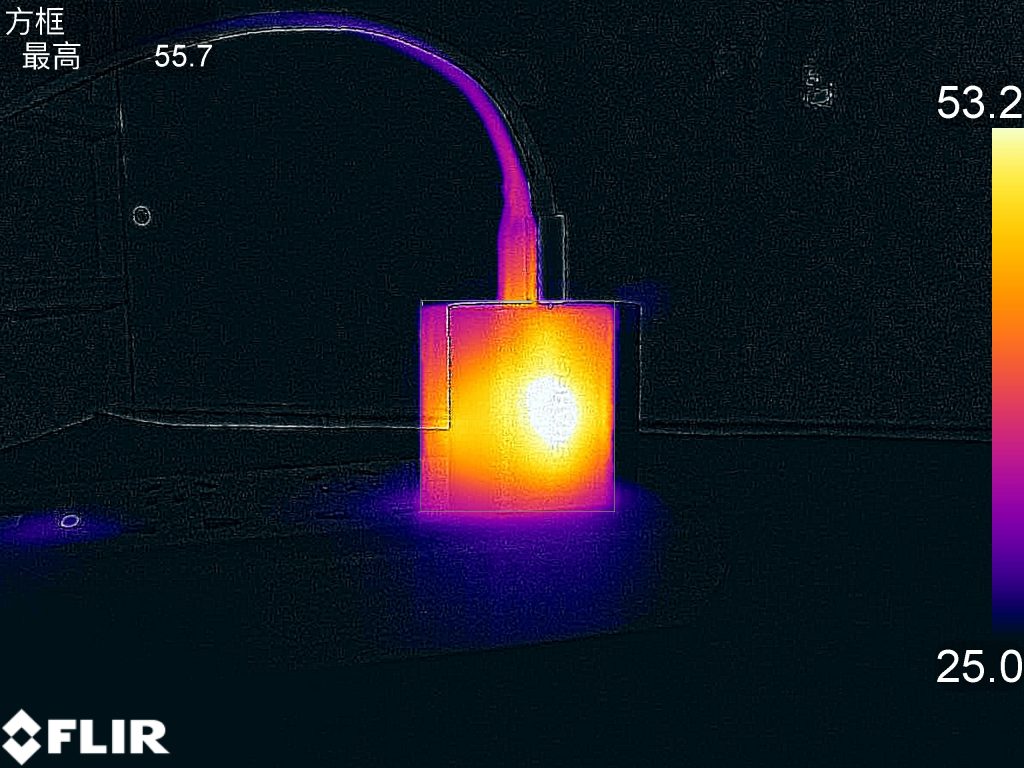 一小时后,当前最高温度为55.7℃,主要集中在充电器中部,温度上升了27.7℃。