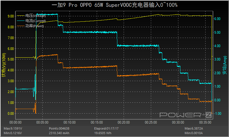 使用OPPO 65W SuperVOOC充电器为一加9 Pro充电,约3分钟前处于关机充电状态,功率在5W左右,随后手机开机功率开始大幅度的上升,整个充电过程高功率充电大致分为三个阶段。