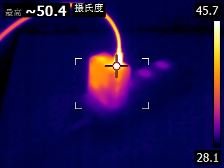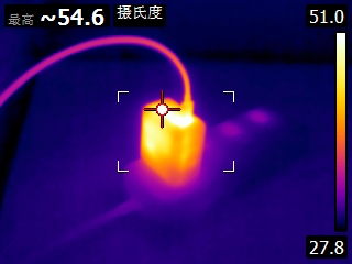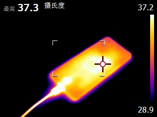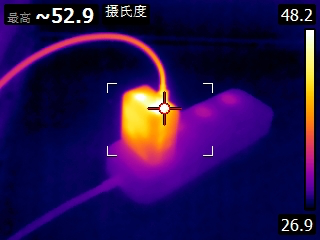 充电进行到28分钟时,充电器最高温度为54.6℃。充电器的三个热成像图中温度最高的位置均在USB-C输出接口附近。