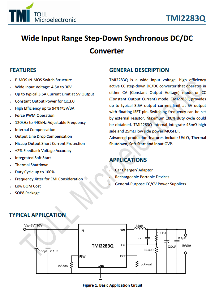 USB-C口降压采用拓尔微TMI2283Q,宽输入范围同步整流降压转换器,支持最高30V输入,最大输出电流3.5A,强制PWM运行,开关频率120-440kHz可设置,输出5V3A效率高达94%,内置输出线损补偿,支持直通模式,内置软启动和热关断及其他保护功能。