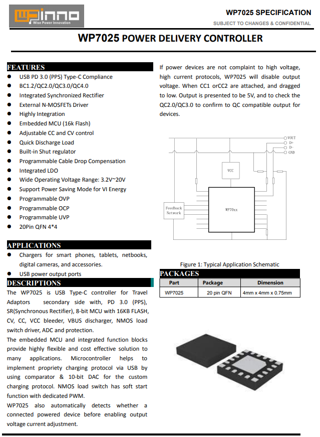wpinno维普创新WP7025是一款高集成度的USB-C PD协议芯片,符合PD3.0,PPS规范;兼容BC1.2、QC3.0、QC2.0、QC4.0等协议。该方案采用20Pin QFN 4*4封装,内部集成了同步整流器、LDO以及嵌入式单片机(16k Flash),采用外置N-MOSFETS驱动,支持3.2V~20V范围的宽工作电压以及VI级能效;具备可编程OVP、可编程OCP、可编程UVP、编程线损补偿技术等功能。