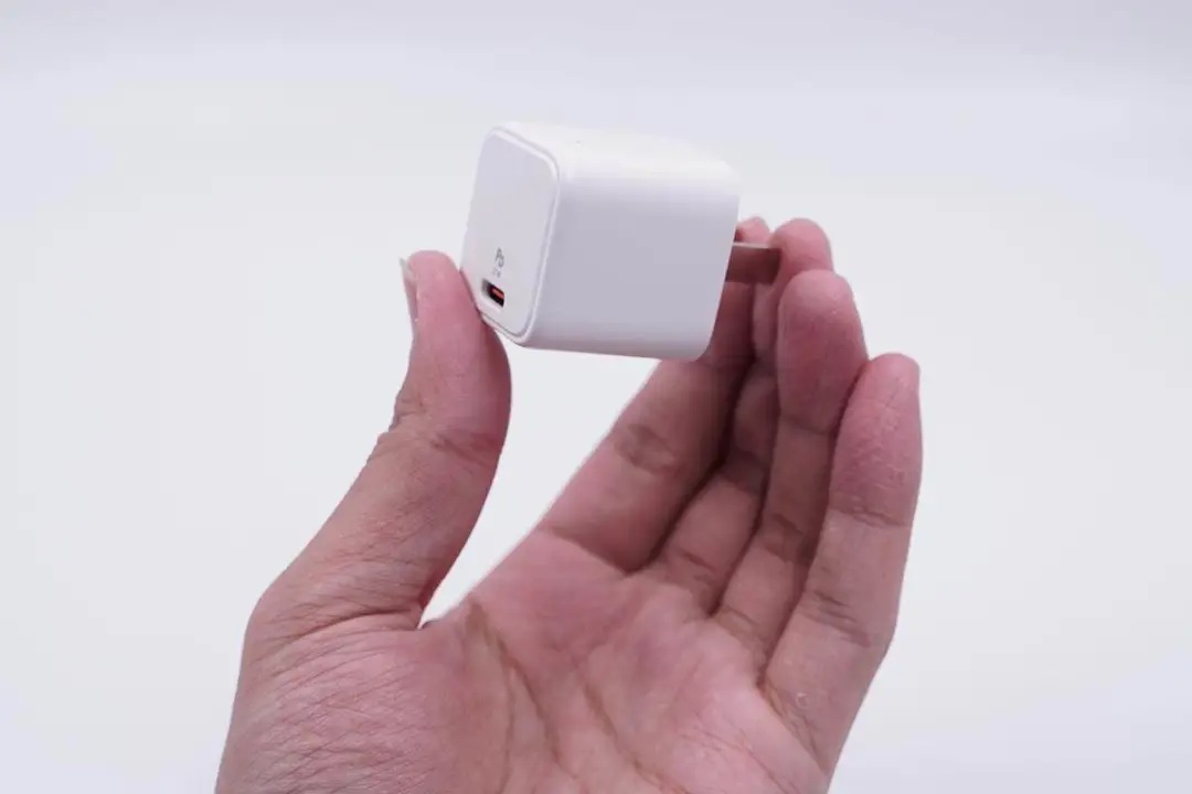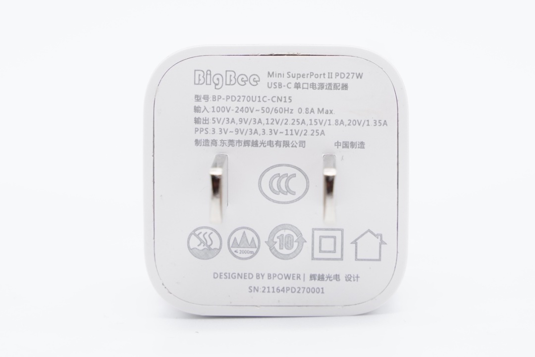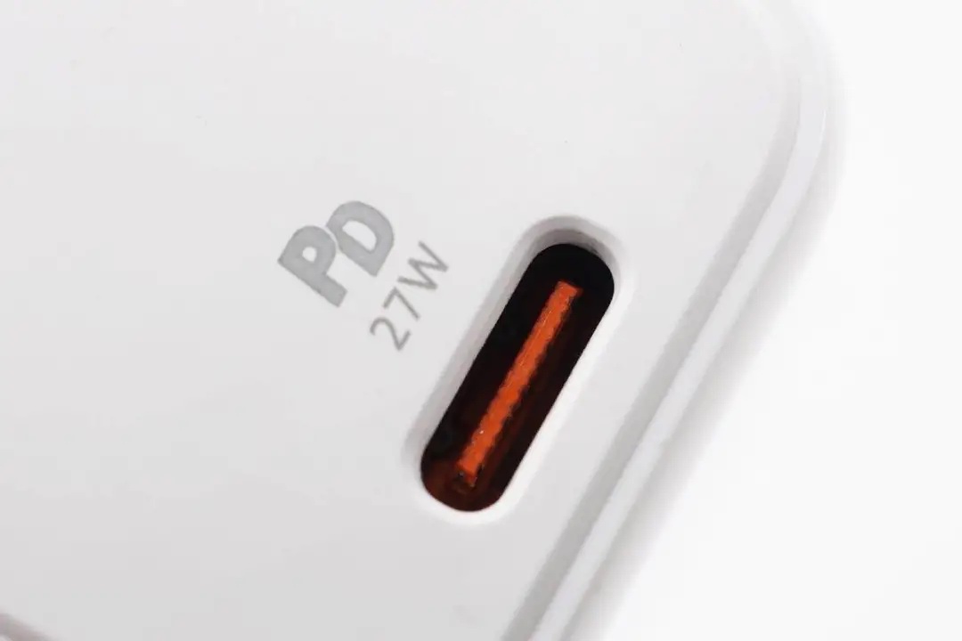 充电器采用单USB-C输出口配置,接口内部为醒目的橙色胶芯,在接口面板上印刷着PD27W的字样也说明了充电器的性能表现。