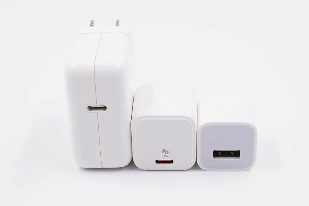 从左至右依次为苹果30W PD快充充电器、辉越光电的27W PD快充充电器以及苹果5W充电器,辉越光电27W充电器采用高密度的立体排布设计,27W的快充输出体积与苹果5W充电器差不多大小。