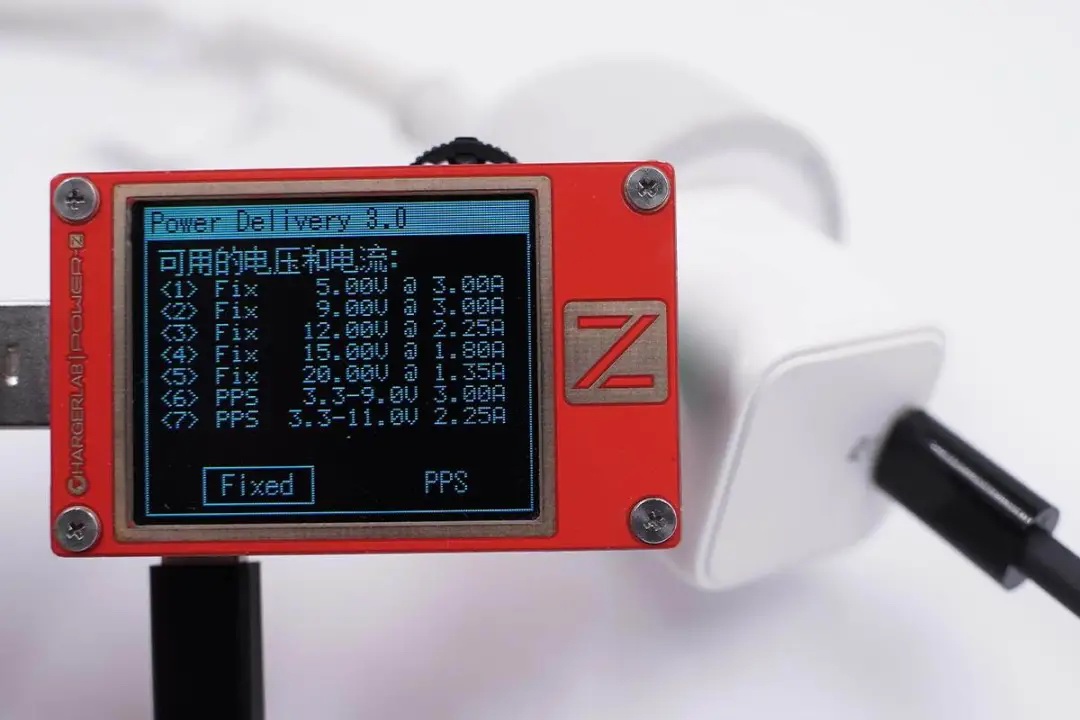 使用POWER-Z KT002 USB测试仪读取充电器的PDO报文,充电器基于USB PD快速充电标准开发,PD版本为3.0。支持5V3A、9V3A、12V2.25A、15V1.8A、20V1.35A五个电压档位,此外还支持3.3-9V 3A和3.3-11V 2.25A两组PPS档位。