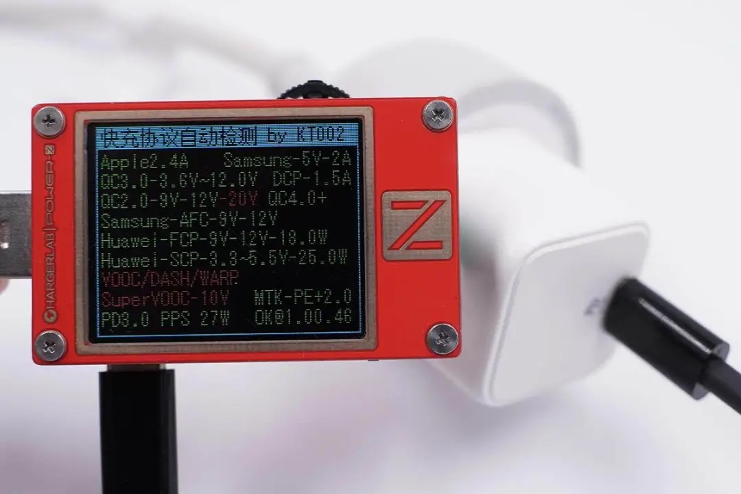 使用POWER-Z KT002读取充电器的快充协议,可以看到除PD快充标准外,还带有市面上常见的多种快充协议,包含了Apple2.4A、QC2.0、QC3.0、AFC、FCP、SCP、MTK-PE等快充协议,可适用于更多设备握手快充。