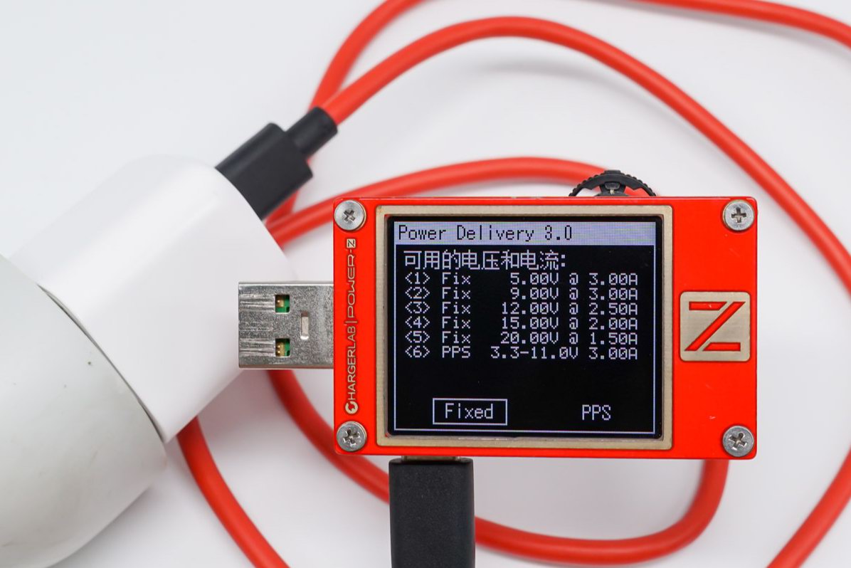 使用POWER-Z KT002 USB测试仪读取充电器PDO报文,可以看到辉越光电33W迷你充电器基于PD3.0快速充电标准开发,支持5V3A / 9V3A / 12V2.5A / 15V2A / 20V1.5A五个固定电压档,另外还带有3.3-11V3A一组PPS电压子集。